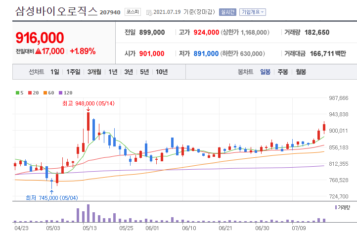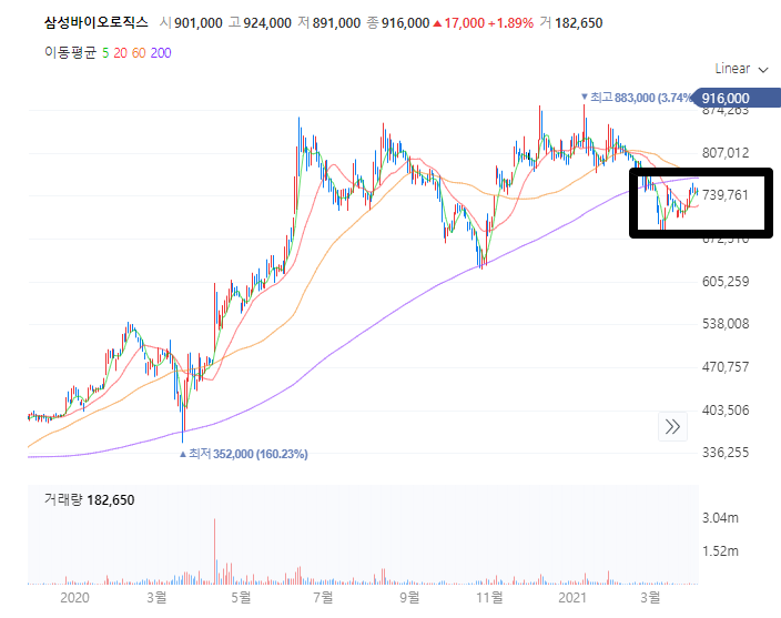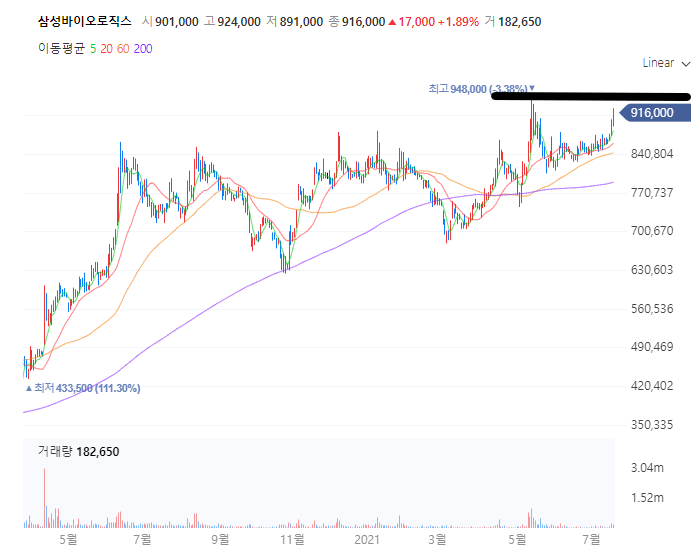 그 후 주가는 신고점을 찍고 하락 후 다시 한번 신고점을 갱신하려고 하고 있습니다. 삼성바이오로직스의 주가는 물론 모더나 관련 이슈가 선반영 되어있긴 하지만 개인적으로 신고점 정도는 가뿐하게 넘지 않을까.. 싶네요.