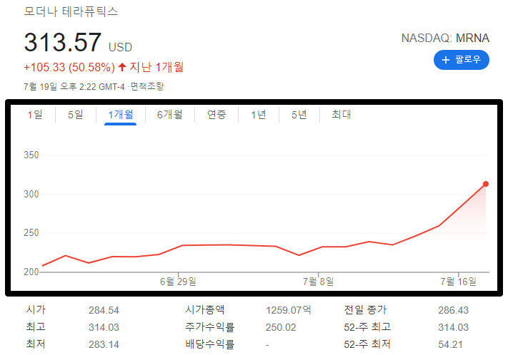 보시면 지금 한달동안 무려 50%가 상승하고 있습니다. 실로 엄청난 상승이라고 해도 과언이 아닌.. 다른 백신 회사들과는 다르게 유일하게 모더나만 주가가 급상승중입니다.