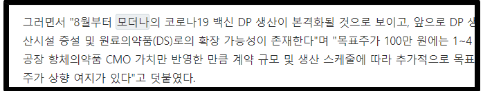 사실 삼성바이오로직스 - 모더나 관계는 매우 끈끈하죠. 8월부터 이미 백신원료생산이 본격화 될 예정이며, 에스티팜 혼자서 하고 있는 원액생산 역시 삼성바이오로직스가 뛰어들 확률이 매우 높습니다. 이미 에스티팜이 원액생산을 혼자서 담당하기에는 무리가 있다고 말했기 때문에 다른 회사가 추가로 지정된다면 무조건 삼바로 라고 봅니다.