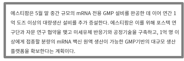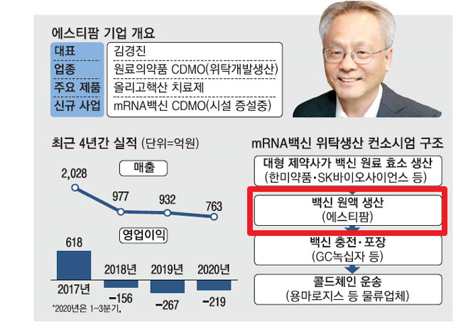 모더나 백신 원료 제작 ( 삼바로, 파미셀, SK바이오사이언스 등 ) - 모더나 백신 원액 생산 ( 에스티팜 )