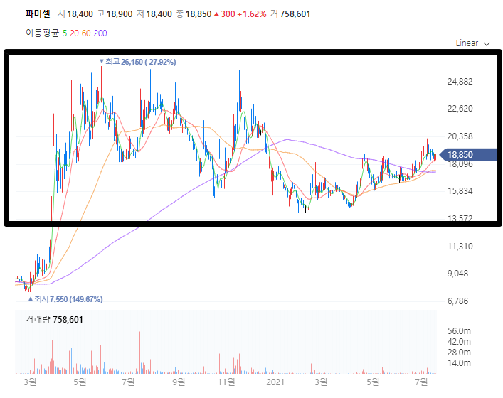 두번째는 파미셀 입니다. 많은 분들이 또 모더나 관련주로 알고있는데요. 요 녀석도 상당히 주목해봐야 합니다. 일단 기본적으로 파미셀은 삼성바이오로직스와 함께 모더나 백신 원료를 위탁생산 하고 있는데요.