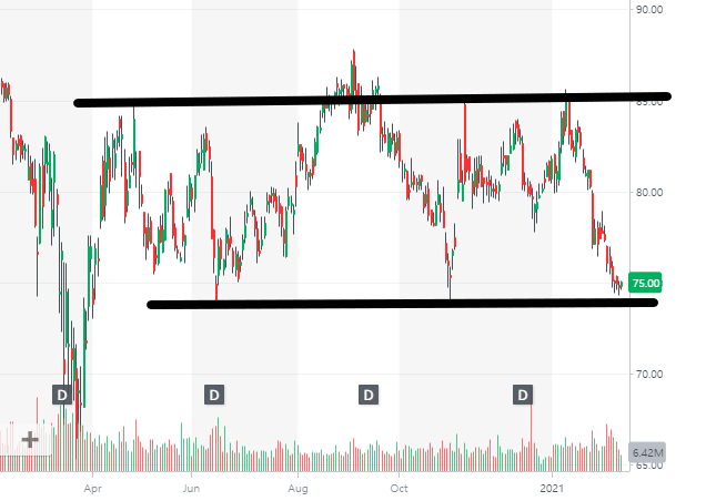 최근에 악재가 연이어 터지면서 박스권 바닥자리 까지 내려온 상황입니다. 코로나 백신 개발 중단 + 탈모약의 부작용 악재가 겹치면서 주가가 굉장히 떡락을 했슨데요. 딱 보시면 박스권이 어느정도 보이시죠??