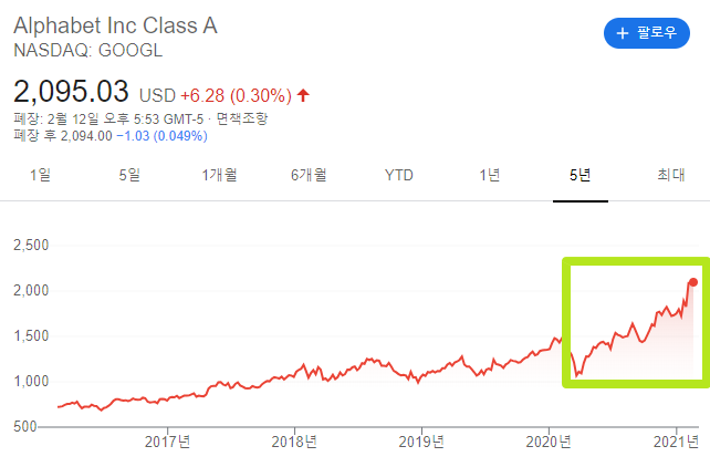 현재 미국의 우량주들은 가격이 굉장히 많이 올라와있는 상황이기 때문에, 지금 사기에는 꽤나 불안한 수 있습니다. 꼭대기 지점에서 사는 것이기 때문이죠. 현재 구글과 애플의 주가를 보시면 사상최고가 지점입니다. 꼭대기 매수는 항상 피해야 하는 주식 격언이지만, 요런 근본주들은 크게 상관은 없습니다..ㅋㅋ