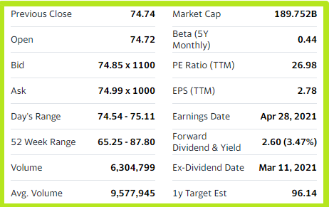 시가총액은 210조에 육박하는 기업이며 현재 1주당 가격이 75불입니다.