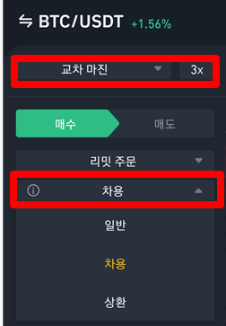 여기 보시면 기본적으로 세팅이 교차 마진 / 차용 주문으로 설정이 되어있는데요. 초보자 분들이 이 상태에서 뭣도 모르고 매매를 하시면 아마 높은 확률이 부채가 발생합니다.