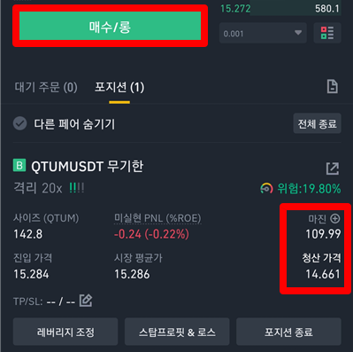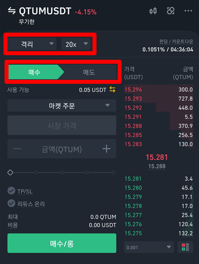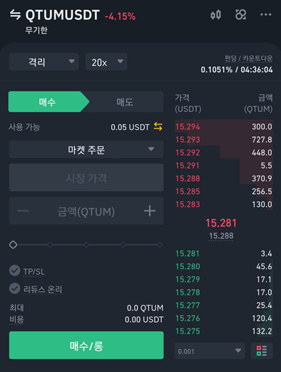 저는 지금 퀀텀에 20배로 롱을 쳐놓은 상태입니다. 참고로 선물거래는 무조건 소액으로만 하세요. 퀀텀이 오를거라고 생각해서 롱을 쳐놓은 상태이며, 반대로 떨어질 것 같다고 생각하면 매도/숏 버튼을 누르면 됩니다. 그리고 오른쪽 아래 청산가격이라는 뜻은 퀀텀의 가격이 14.661 달러까지 오게 되면 내가 매수한 금액은 모두 사라지게 됩니다.