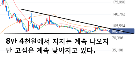 또한 지금 일봉상 8만 4천원 밑으로는 잘 내려가지 않으려는 모습을 보여주긴 하는데 고점은 계속해서 낮아지고 있습니다. 보통 저런 삼각형의 형태를 띄게 되면 하락형 삼각수렴이라고 볼 수 있습니다.