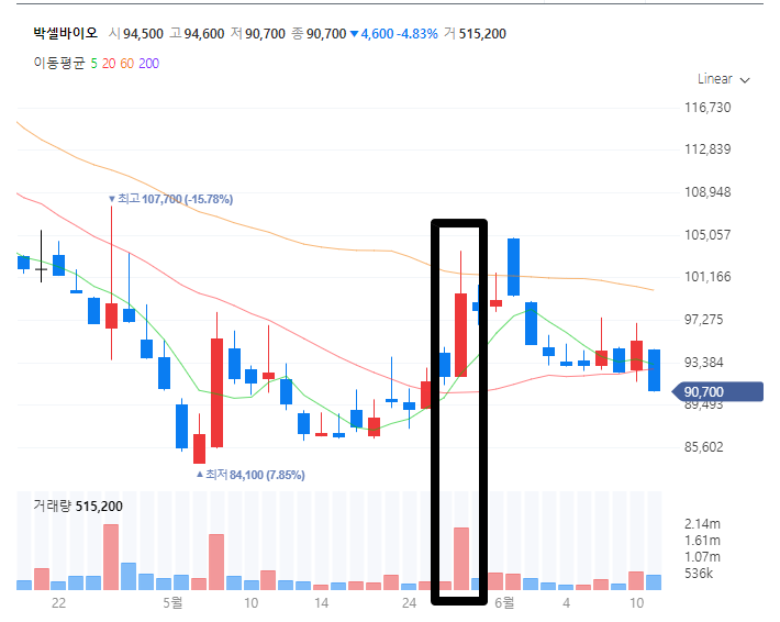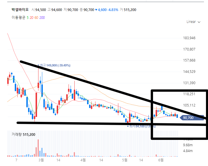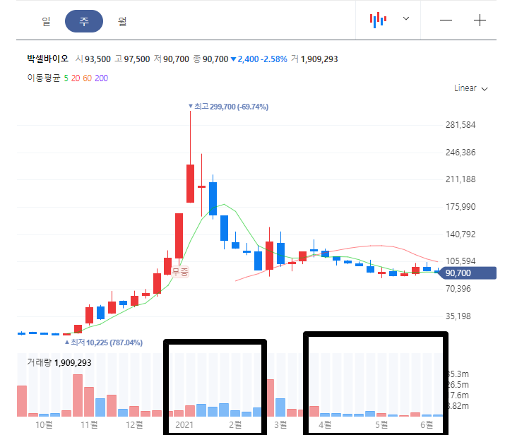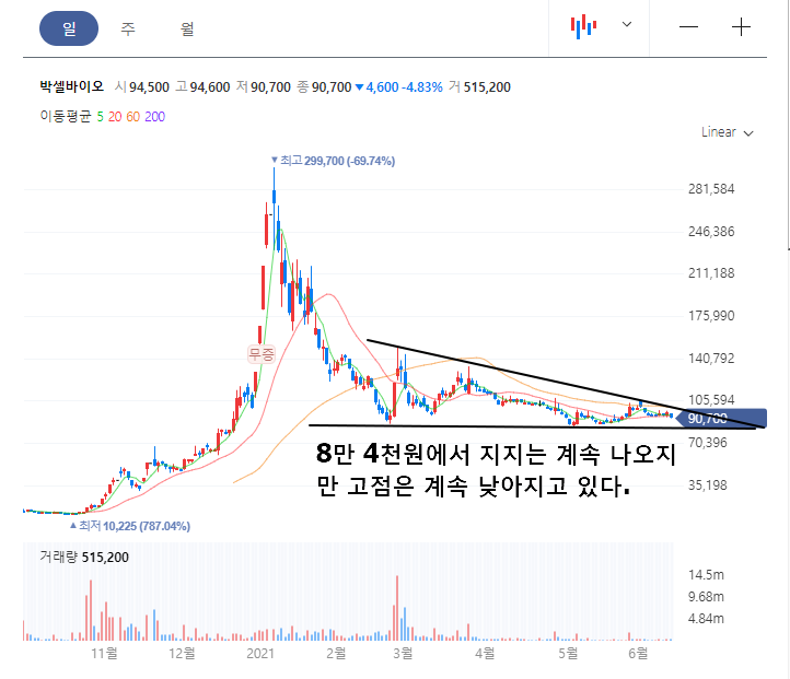 박셀바이오 주가는 현재 20만원대였던 주가가 9만원까지 내려온 상황입니다. 내려오면서 거래량이 계속 터지면서 내려온건 아니지만.. 저 위에 물려있는 개미들이 꽤 많을것으로 예상됩니다.