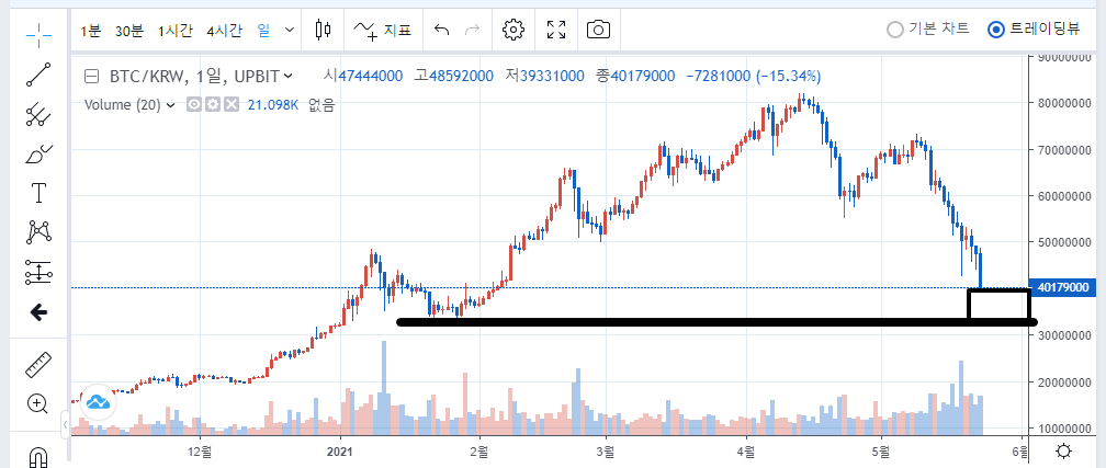 적어도 업비트 기준으로 3천만원 초반대는 되어야지 진정한 바닥이라고 볼 수 있을 듯 싶습니다. 2월 저점이었던 곳에서 저항이 나왔었고 어느정도 충분한 지지를 해주고 폭발적인 상승이 나왔기 때문에.. 아마 거기까지는 떨어지지 않을까 싶습니다.