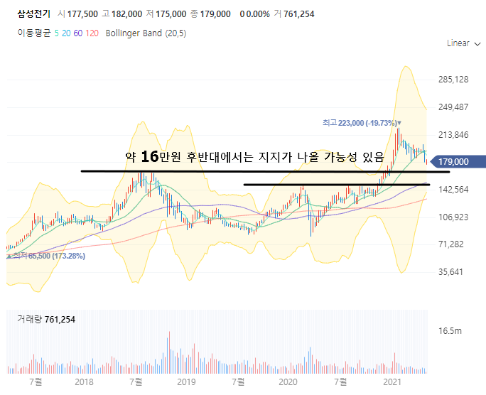 제 개인적으로는 삼성전기는 조금만 더 기다리시다가 17만원 초반대나 16만원 후반대에 왔을때 조금씩 매수하는게 좋아보입니다. 물론 여기서 다시 상승이 나올수도 있겠지만.. 저라면 굳이 그런 위험은 감수하지는 않을듯 싶습니다.
