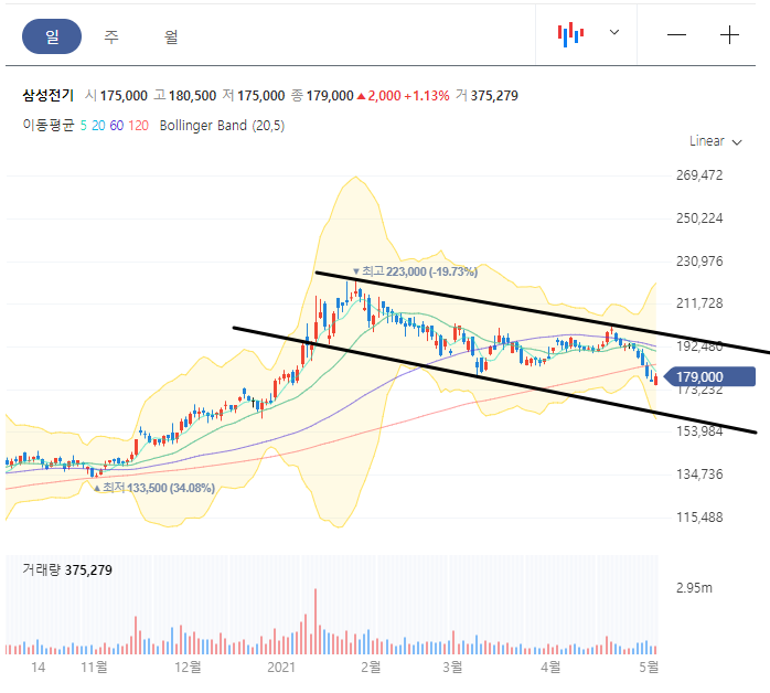 고점에서 매수하신 기존 주주분들이 기분 나쁘시겠지만 삼성전기는 조금 더 떨어질때까지 기다리는게 좋겠습니다. "충분히 떨어졌어" 라고 생각해서 들어갔는데 물리는 경우 수도 없이 경험했습니다..ㅠ