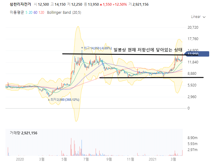 삼천리자전거가 2021/03/25일 상당히 화끈한 장대양봉을 뽑아주었습니다. 제가 얘기해본 주린이 분들은 삼천리자전거가 상장 되어있는지도 잘 모르시더라구요. 물론 주목을 받게 된건 아무래도 최근부터이다 보니까..