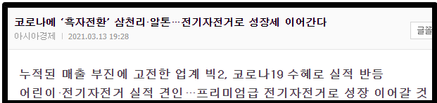 전기자전거가 나오기 이전에는 매출부진 때문에 계속 적자를 보고 있던 기업이었는데 전기자전거 때문에 다시 엄청난 턴어라운드로 인해 주가가 폭발적으로 상승한거죠.