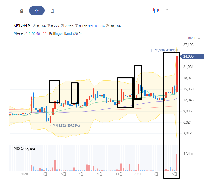 서린바이오의 주봉차트를 보시면 윗꼬리가 상당히 많이 달리면서 어느정도 매집의 흔적이 보여져 있습니다. 아마 모더나 관련주로 상승을 했을때의 모습 같은데, 결국 어제, 오늘 엄청난 거래량과 함께 큰 상승이 나왔죠.