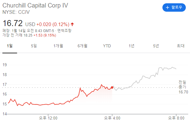 CCIV는 전기차 회사 '루시드 모터스'와의 합병 찌라시가 나오면서 현재 엄청난 상승을 보여주고 있습니다. 합병이 확정난게 아닌데도 이정도 상승을 보여준다는게 ... 물론 '루시드 모터스'가 세간의 엄청난 관심을 받고 있기 때문에 가능한 일인거라 생각합니다. 루시드가 아니었다면 이정도의 상승은 힘들었겠죠.