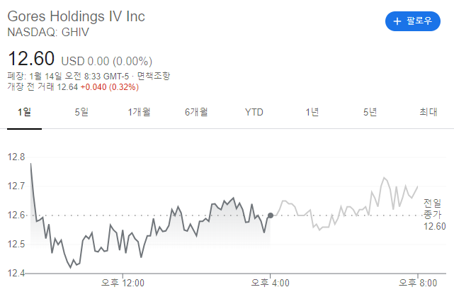 위의 두 회사를 보면 알다시피 전기차 관련 기업과 합병하는 SPAC주가 엄청난 주가 상승률을 보여주고 있습니다. 아무래도 바이든 정부의 정책을 힘입어 더욱 기대를 받는 게 주된 이유겠죠. 이 밖에도 부동산 관련 기업 UMZ와 합병소식이 돌고 있는 GHIV도 있습니다. 하지만 상대적으로 이 스팩주는 주가상승을 크게 보여주지 못하고 있습니다.