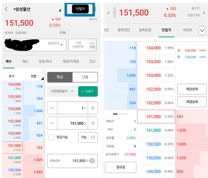 나무 역시 마찬가지인데 , 단일가 주문 창으로 들어가셔서 우측 상단에 단일가라고 써진 검은 버튼을 누르면 단일가 호가창으로 진입하게 됩니다. 거기서 가격대를 확인 한 뒤에 시간외단일가 매수/매도 주문을 넣어주면 됩니다.