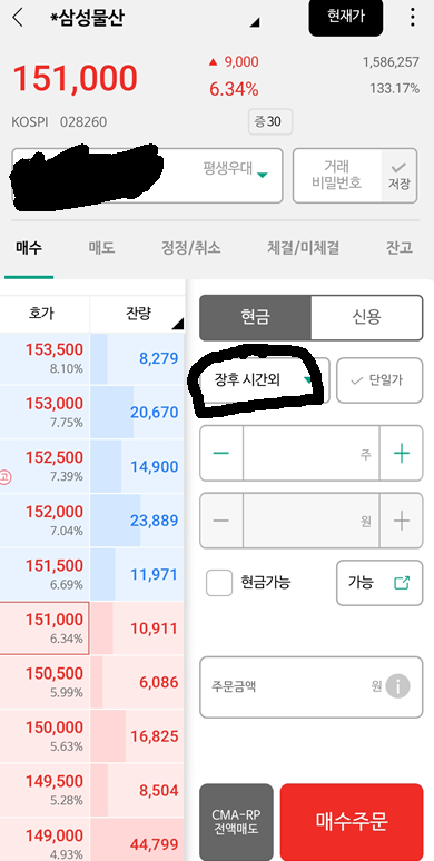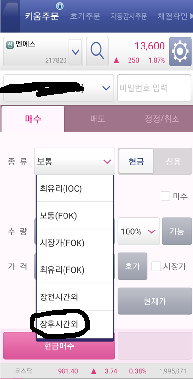자 일단 주식 주문 화면으로 들어가서 네모박스를 눌러줍니다. 저걸 눌러서 쭉 밑으로 내려가면 장전/장후시간외 가 적혀 있는게 있는게 그걸 선택해줍니다. 전 장후시간외를 클릭해보겠습니다.