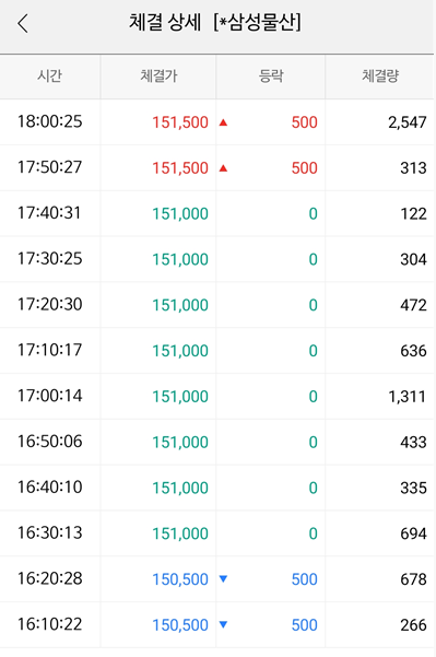저는 장후시간외 거래를 하는 것이기 때문에 위 사진처럼 보이는 엔에스와 삼성물산의 종가로 장후시간외 거래를 하게 되는 것입니다. 장후시간외거래는 동시호가가 끝난 후 15 : 30 부터 주문을 받기 시작해 15 : 40 분부터 체결이 들어가게 됩니다.