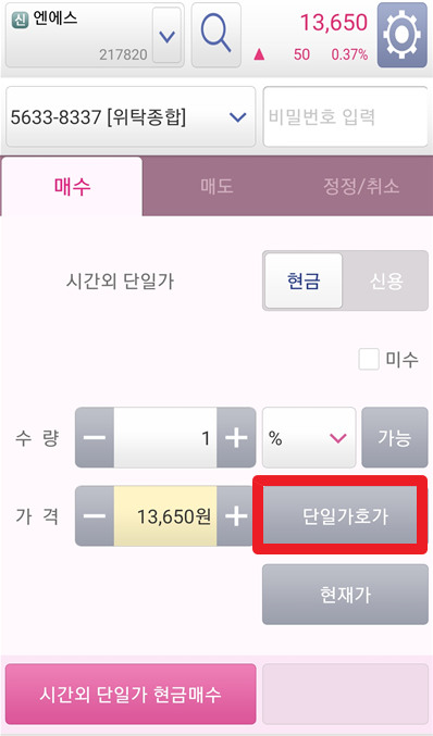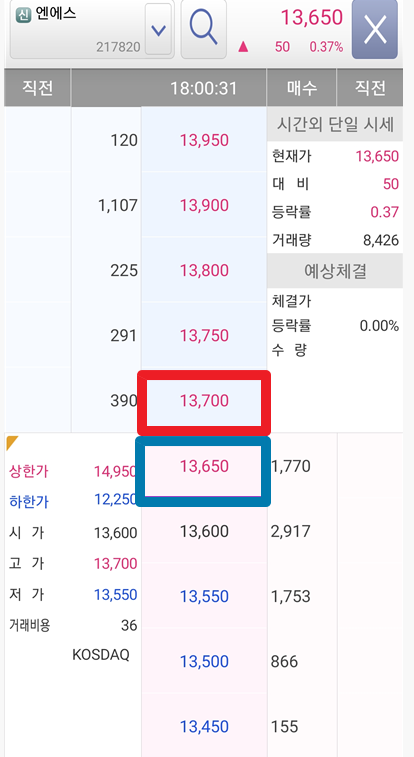 그러면 단일가 호가창이 나오는데 확실하게 매수체결을 하고 싶다면 13,700원이 있는 가격대에 걸어주고, 확실하게 매도를 하고 싶다면 13,650원이 있는 가격대에 매도를 걸어주면 됩니다.