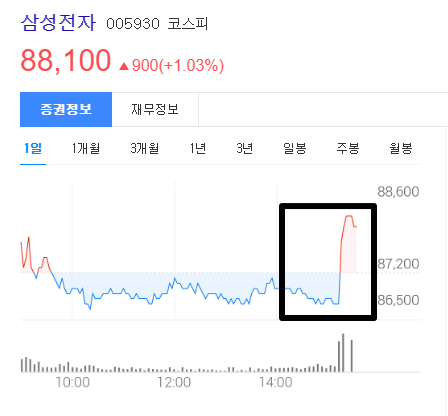 삼성전자 - 인텔의 반도체 위탁생산 수주 소문이 장 막판에 떠버려 삼성전자에 엄청난 매수세가 들어오면서 갑자기 주가가 86,500 원에서 88,100 원으로 순식간에 슈팅을 해버렸습니다.