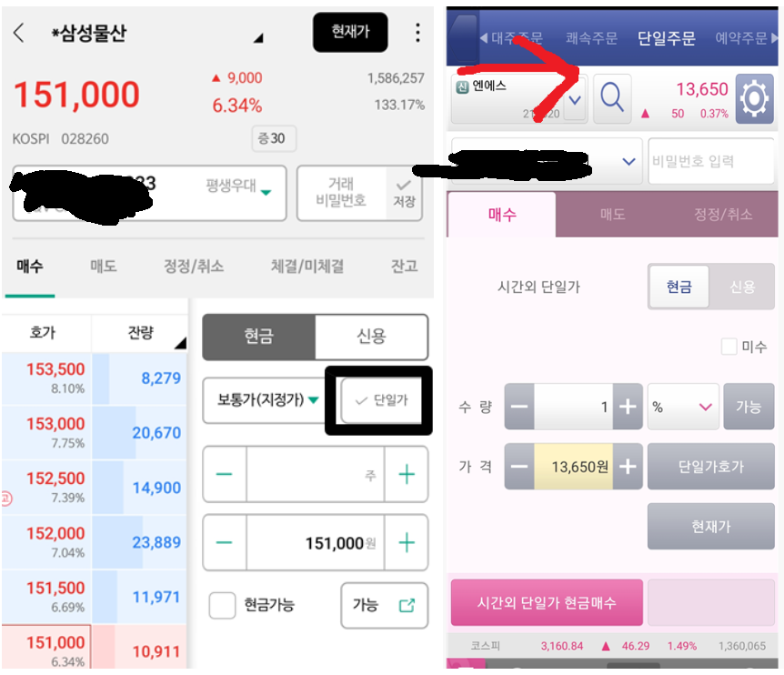 나무 어플은 검은색 네모 박스를 눌러주시면 바로 주문 창으로 갈 수 있으며, 영웅문은 주식주문 기본 창에서 맨 윗단을 옆으로 슬라이드 해 넘기시면 단일주문 탭이 나오는데 거기로 들어가셔야 됩니다.