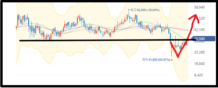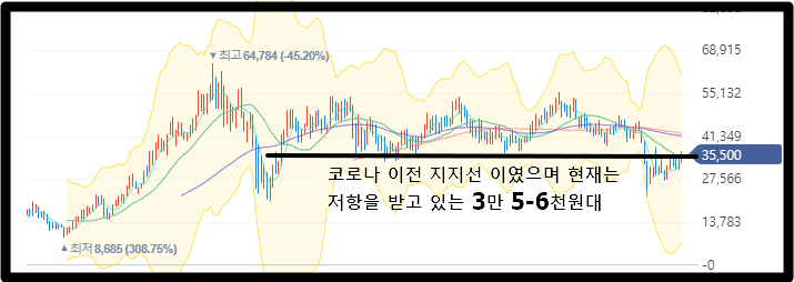 두번째가 바로 중요한 선인데 바로 코로나 사태 이전에는 지지선이였다가 깨져버리고 현재는 저항선으로 바뀐 선입니다. 이 선은 3만5천원대에 형성되어 있는데 지금 주가가 딱 그곳에 위치하고 있습니다.