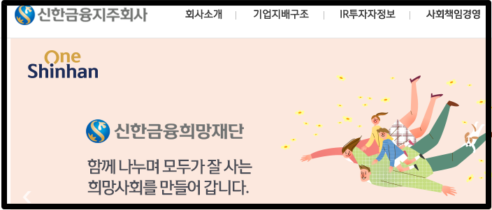 음 신한지주가 뭘 하는 회사인지는 자세한 설명은 필요 없을 것 같습니다. 신한은행, 신한카드, 신한금융투자, 생명보험 등등 많은 금융 관련 사업을 하는 회사입니다. 이 전체가 속해있는게 바로 신한지주 입니다.
