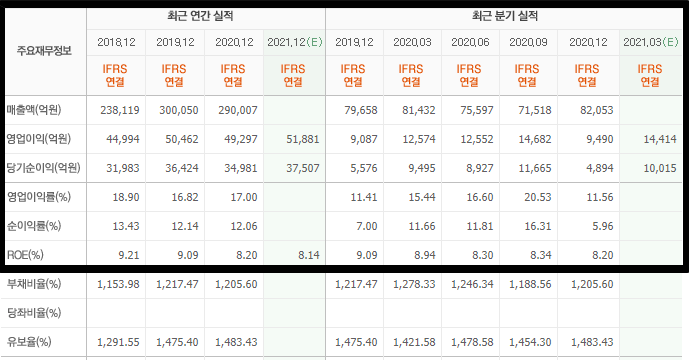 신한지주는 뭐 워낙 대형 지주회사이기 때문에 재무제표나 실적도 좋습니다. 특히 2021년 예상매출이 매우 좋을 것 으로 예상됩니다. 사실 대부분의 대형지주사는 기본적으로 실적은 탄탄하기 때문에 재무제표나 실적을 보기 보다는 배당률이나 차트를 봐주는게 더 좋습니다.