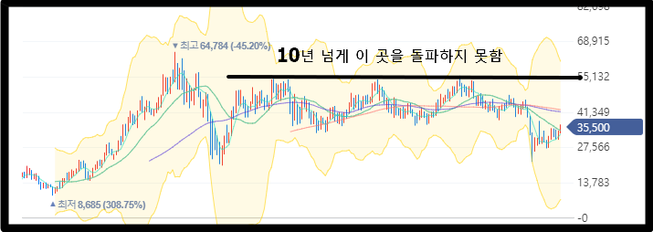 첫번째는 맨위에 월봉상 저항선입니다. 이 선은 아주 크게 봤을때 5만5천원대에 형성되어있는데 대체적으로 저곳을 뚫지 못하고 다시 하락하는 현상을 무려 10년 넘게 보여주고 있습니다.