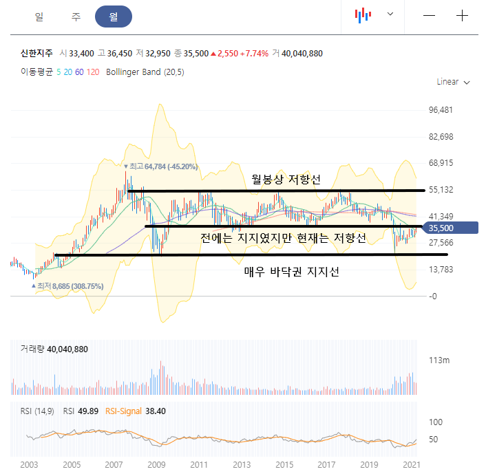 제가 많은 지주사들 중에서 신한지주를 뽑은 이유는 월봉차트가 이쁘기 때문인데요. 현재 지지/저항선을 그어봤을때 크게 3가지 선이 나오게 됩니다.