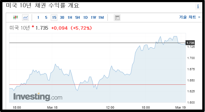 미국 10년 채권 수익률이 또 폭등하고 있습니다. 벌써 1.7은 가볍게 넘겨버리고 1.8을 향해 달려가고 있는 상황인데요. 아무래도 포트폴리오에 기술주/성장주 위주로 매수하신 분들은 상당히 힘든 시기일 거라고 생각합니다. 물론 지금은 존버해야할 타이밍 이구요.