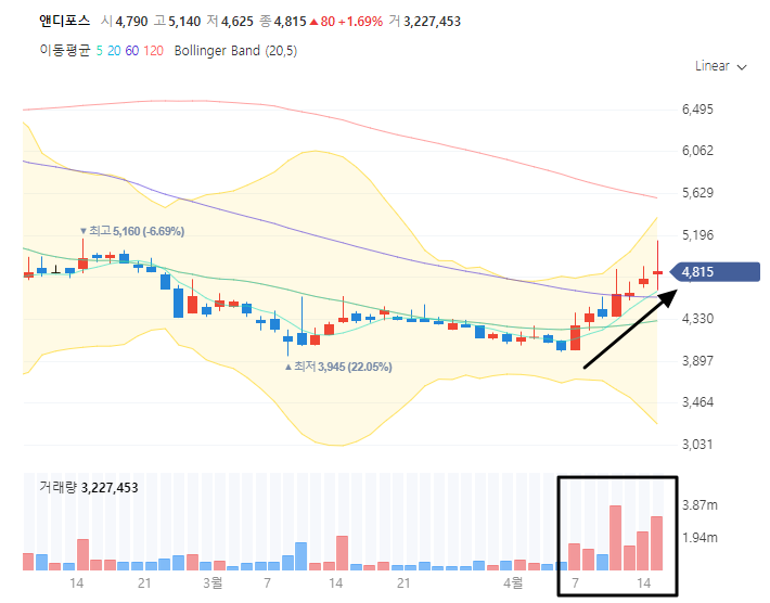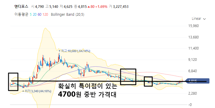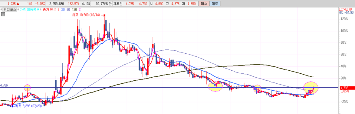 그럼에도 제가 앤디포스를 어느정도 관심종목에 넣어두고 눈여겨 보고 있는 이유는 현재 주가가 중요 매물대 부근을 돌파했기 때문인데요. 보시면 4번의 주요 터치가 있던 4700~4770원대를 오늘 뚫었습니다.