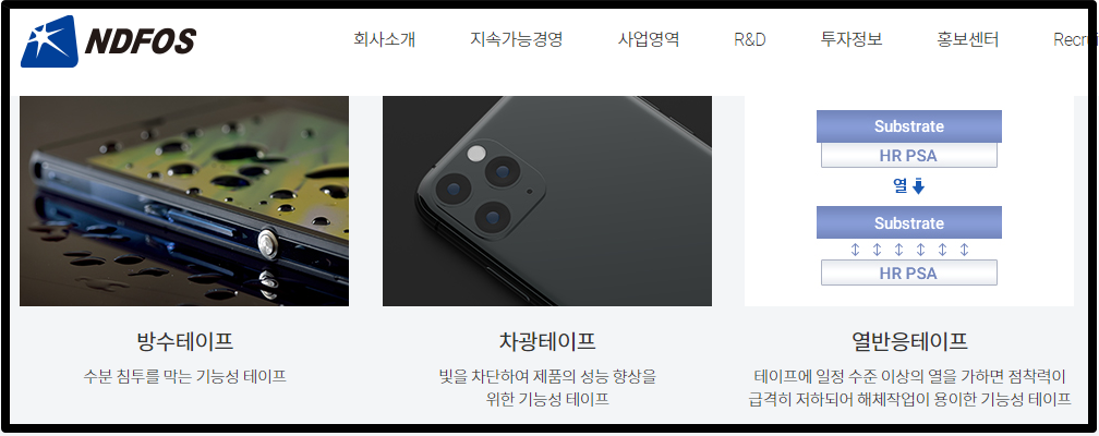 앤디포스는 원래 모바일기기용 양면 테이프 및 윈도우 필름 개발/생산/판매를 영위하고 있는 기업입니다. 2010년에 설립된 상당히 따끈따끈한 기업이죠. 상당히 우수한 기술력과 품질경쟁력으로 수입부품에만 의존하고 있던 테이프시장을 단기간에 국산화 했습니다.