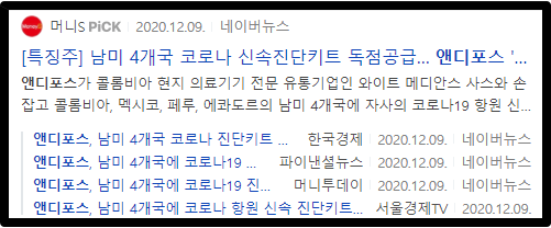 특히 앤디포스의 코로나 진단키트가 유럽과 남미에서 상당히 좋은 반응을 얻어 독점공급 계약도 체결 하기도 했죠. 앤디포스의 주가가 큰 상승을 했던게 바로 이 뉴스들 때문이었습니다.
