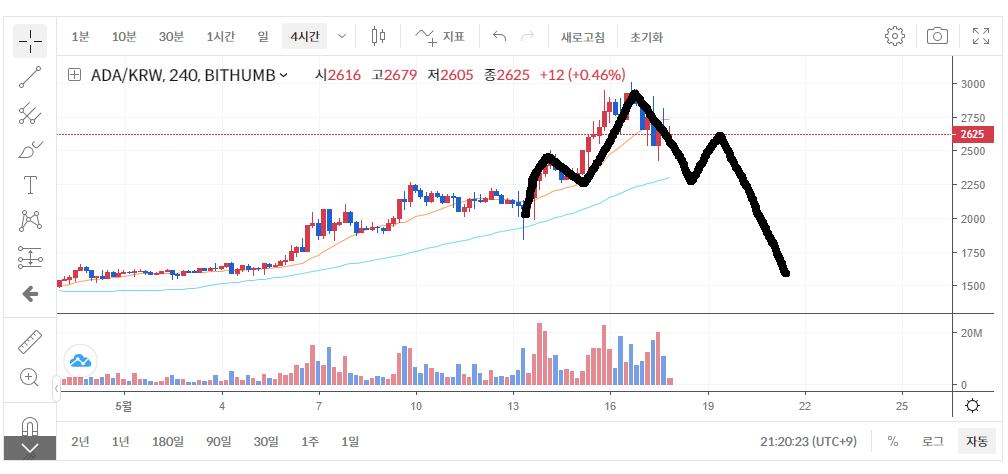 비트코인과 다른 알트코인들이 엄청난 하락을 했음에도 에이다는 꽤 방어력이 좋은 모습을 보여주고 있긴 합니다. 하지만 지금 구간에서는 하락 + 횡보는 무조건 할거라고 보여집니다. 너무 급하게 올라왔기 때문에..