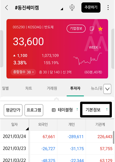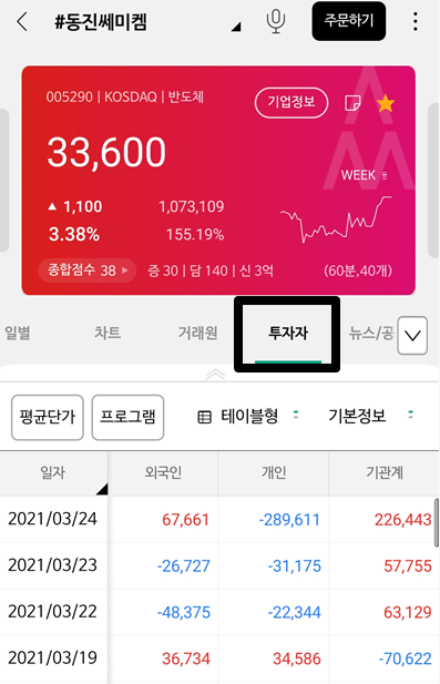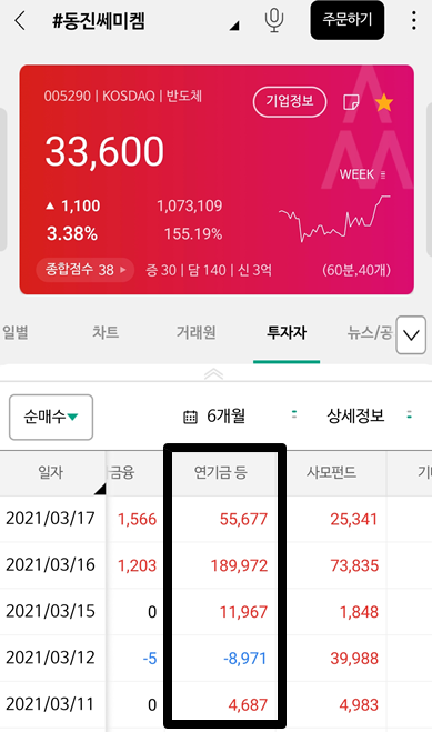 자 투자자 탭을 누른 상태에서 오른쪽에 보이는 기본정보 메뉴를 눌러주면 상세정보로 바뀌게 되는데요. 그 상태에서 옆으로 스크롤 해주면 연기금 등 의 순매수 현황이 나오게 됩니다. 빨간 상태면 순매수, 파란 상태면 순매도 상태입니다.