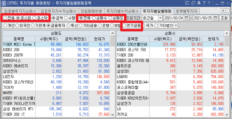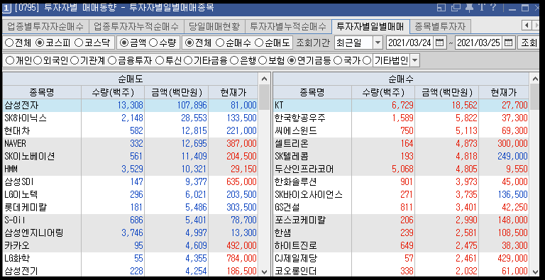 2021/03/24 일 기준으로는 연기금이 KT, 한국항공우주, 씨에스윈드를 TOP 3로 매수했네요. 매도 종목을 보시면 2차전지 관련주를 많이 팔고 코스피 시총 상위 종목도 많이 팔고 있습니다.