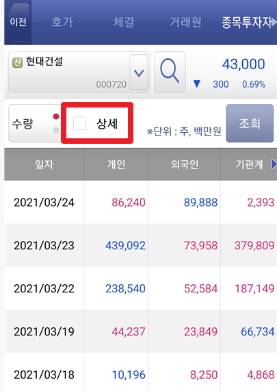 자 그다음에 상세가 써져있는 네모칸을 체크해주시고 옆으로 스크롤 해주면 저렇게 세부적인 기관계 투자자들의 수급 내역이 나오게 됩니다. 저기서 연기금 등을 찾아서 확인해주시면 되죠.