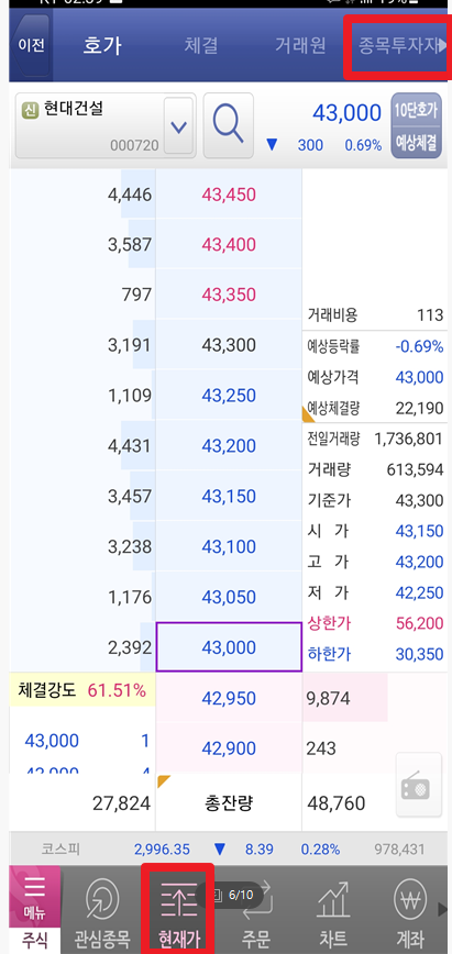 영웅문도 매우 쉽게 연기금의 수급을 확인할 수 있는데요. 일단 그 종목을 클릭해서 현재가 창으로 들어가 준 다음에 위에 메뉴 탭에서 종목투자자 탭으로 들어가줍니다.