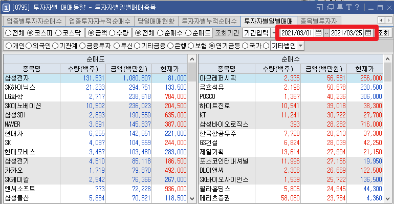 이번엔 기간을 설정해서 보겠습니다. 3월 한달 동안 연기금의 매매 동향입니다. 가장 많이 매수한건 아모레 퍼시픽이고 가장 많이 매도한건 삼성전자네요. 보시면 연기금의 매도가 왜 코스피에 영향을 주는지 보이시죠? 코스피 시총 상위주를 계속 매도하고 있기 때문입니다.