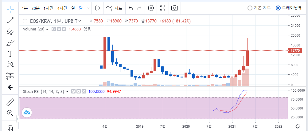 이오스는 최근에 블록원 거래소 설립 추진 호재로 큰 상승이 나와준 상태인데요. 그럼에도 불구하고 아직 2017-18년도 전고점을 넘지 못한 상황입니다. 개인적으로 현재 코인장을 봤을때는 이오스 역시 전고점을 충분히 넘을거라 생각합니다 다만.. 그 전까지 어떻게 시세를 흔들지는 아무도 모르죠.