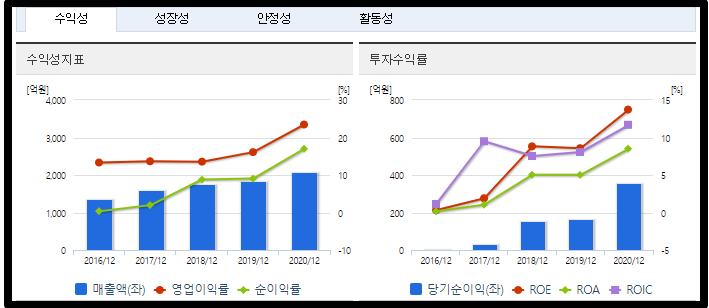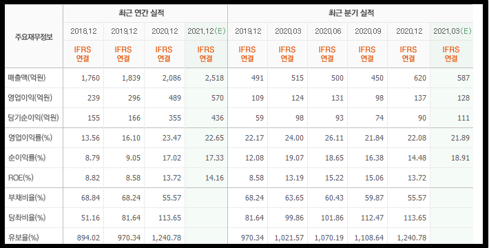 인선이엔티의 재무정보 입니다. 매우 건강한 실적표라고 할 수 있겠습니다. ROE도 2020년에는 두자리수를 돌파했으며 2021년에는 더욱 실적이 좋아질 것으로 예측되고 있습니다. 유보율과 부채비율도 아주 괜찮습니다. 매출까지 우상향하는 그림을 보여주네요. 아주 베스트