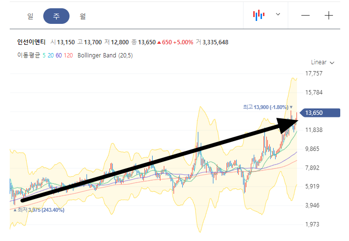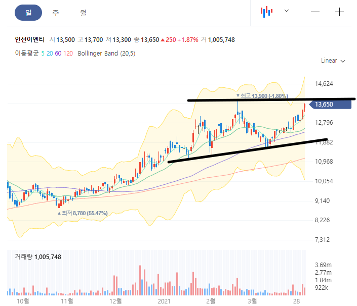 다만 이제 인선이엔티의 단점은 현재 주가가 역사적 신고가 자리라는 것입니다. 이 자리에서 사게 되면 주가의 최정점 자리에서 매수하는 것이기 때문에 아무래도 위험부담이 좀 있습니다. 물론 여기서 그냥 계속 올라갈 수도 있구요.