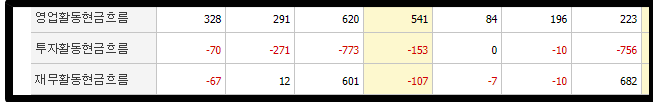 거기에 현금흐름도 매우 건강하구요. 투자 꾸준히 하고 있고 영업활동으로 인해 벌어들이는 현금흐름은 계속 우상향 중입니다. 대기업이 아닌 이상 재무활동현금흐름은 전체가 빨간색이기 힘듭니다 어차피.