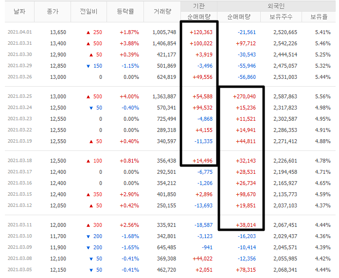 또 인선이엔티를 눈여겨 봐야할 점이 수급 측면에서 있는데요. 기관과 외국인들이 상당히 공격적으로 순매수를 했더라구요. 2022년부터 건설폐기물 처리 수수료 단가도 현재보다 48%나 증가할 예정이며, 매립지 반입 비용이 지속적으로 올라갈 예정이기 때문에 벌써부터 미리 매수해놓는게 아닐까 생각합니다.