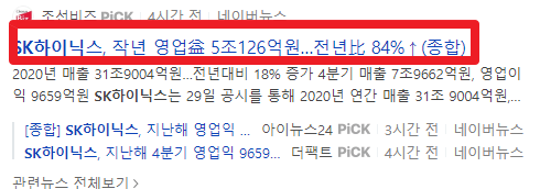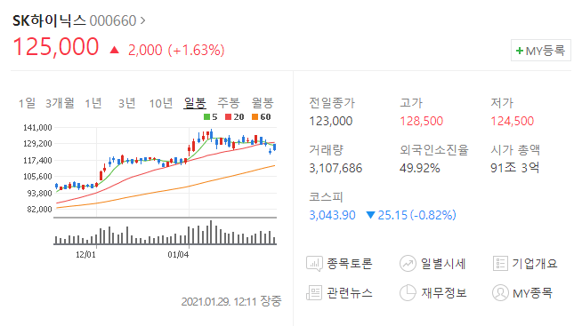 마지막은 SK하이닉스 입니다. 국내 반도체 2대장중 동생을 맡고 있는 SK 하이닉스.