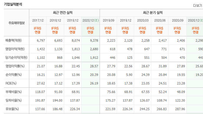 실적도 아주 탄탄하고, 매출도 꾸준히 잘나와주는 회사입니다. 유보율이 낮은게 아쉽지만 괜찮습니다. 이미 영업이익이 2018도에 비해 1500억원이나 증가했습니다.