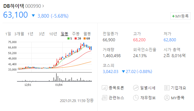 두번째는 DB하이텍 입니다. 우리나라 파운드리 기업 중에서도 손꼽히는 기업이죠.