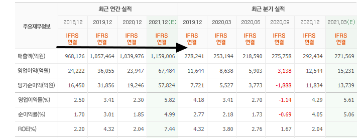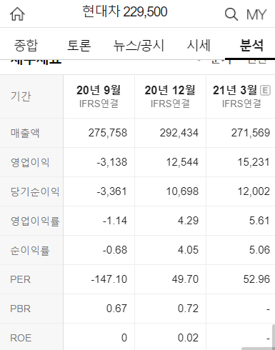 현대차의 재무제표입니다. 2021년 예상매출이 10조 6천억원이 나올 것으로 예상되고 있습니다. 솔직히 자동차 산업은 매출이 카카오처럼 늘기는 힘든 업종이지만 그래도 어느정도 매출이 증가할 것으로 예상되기 때문에 주가도 충분히 다시 오를 수 있는 힘이 있다고 판단되는거죠.